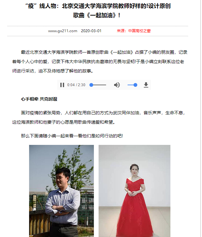【中国高校之窗】“疫”线人物:北京交通大学海滨学院教师好样的!设计原创歌曲《一起加油》!