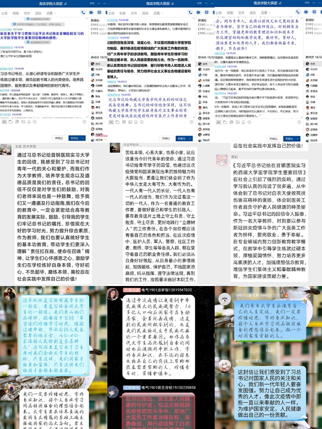 自学习研讨活动开展以来收到了全校各单位师生的所感所悟,大家纷纷表示读完习总书记的回信受到了思想洗礼,向那些投身于疫情一线的医务工作者致以崇高的敬意,同时也深刻感悟到了作为新一代青年所应肩负的家国责任与时代使命。