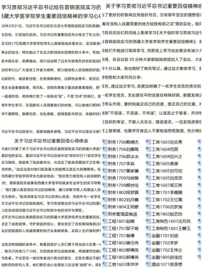 为响应学校学习习近平总书记给在首钢医院实习的西藏大学医学院学生的回信精神,培养社会主义核心价值观,坚定对马克思主义的信仰,弘扬“抗疫精神”,特此我校经济管理学院党总支学生党支部组织学生党员以云共享的形式,开展以“悟回信 学精神 练本领 做贡献”为主题的线上学习活动。