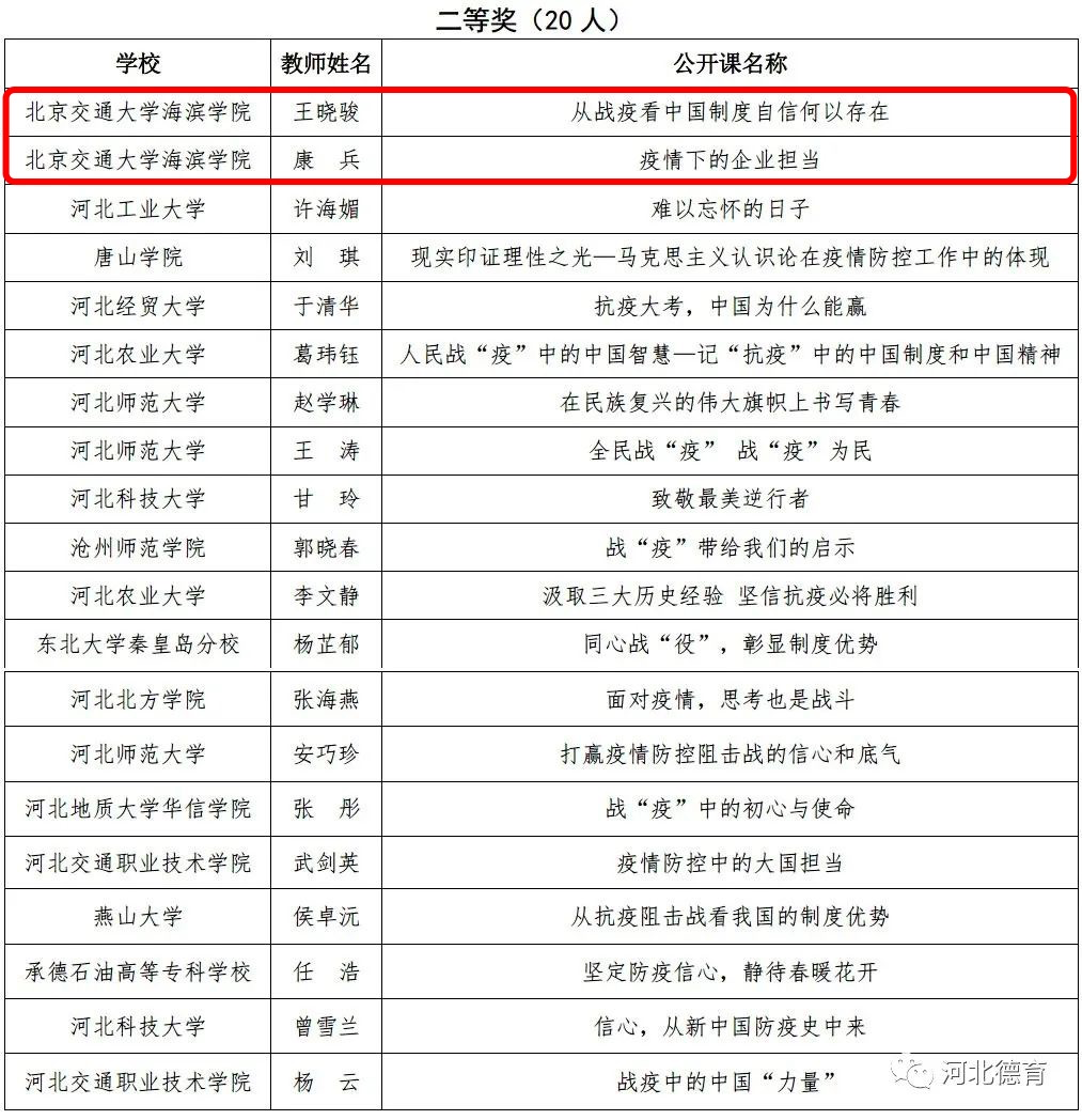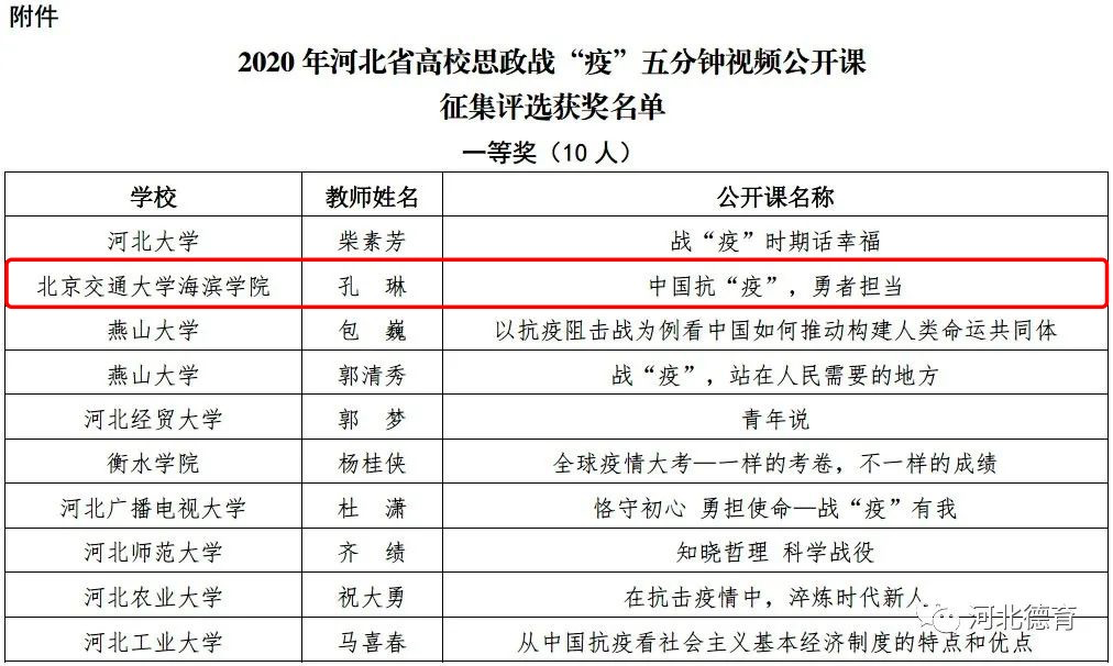 为学习贯彻习近平总书记关于新冠肺炎疫情防控工作的系列重要讲话精神,按照教育部社科司印发的《新冠肺炎疫情防控期间高校思想政治理论课教学组织工作规程》要求,创新性做好当前疫情防控形势下大学生思想政治教育工作,河北省教育厅在全省高校组织开展思政战“疫”五分钟视频公开课征集评选活动。我校高度重视,并组织思政课和辅导员教师踊跃参与、积极申报。经专家评审,我校教师孔琳的主讲作品《中国抗“疫”,勇者担当》荣获一等奖,教师王晓骏的主讲作品《从战疫看中国制度自信何以存在》、教师康兵的主讲作品《疫情下的企业担当》荣获二等奖。