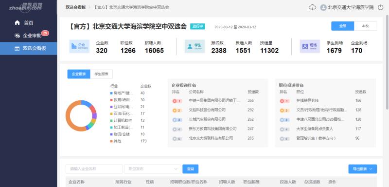 3月12日,我校携手智联招聘成功举办“北京交通大学海滨学院2020届毕业生春季大型空中双选会”,其中参会企业320家,提供职位1266个,提供岗位16065个,参会企业中国企52家,上市公司30家,外企7家,股份制企业38家,京港地铁、中建八局、中铁三局、北京交控科技、中国工商银行、顺丰速运等知名企业参与招聘。此次双选会筹备组织中在广泛宣传邀请、重点单位对接、智联招聘资源共享、高度匹配审核筛选单位等环节下足功夫,为我校毕业生提供更高质、更匹配的就业岗位;2020年4月8日我校成功举办第二场空中双选会——“北京交通大学海滨学院2020届毕业生互联网+、管理、语言、艺术类空中双选会”,共提供职位279个,提供岗位3676个,基本包含我校互联网、管理、语言、艺术类所有专业。“春暖海滨、就业先行—北京交通大学海滨学院2020届毕业生第三场空中双选会(双选月)”已经开始,目前已经审核通过单位65家,学生投递简历200余次。截止日前,我校共举办三场大型双选会,近20场专场宣讲会,预计提供岗位22000份,人均提供岗位数7个,给我校毕业生提供了广阔的求职空间。