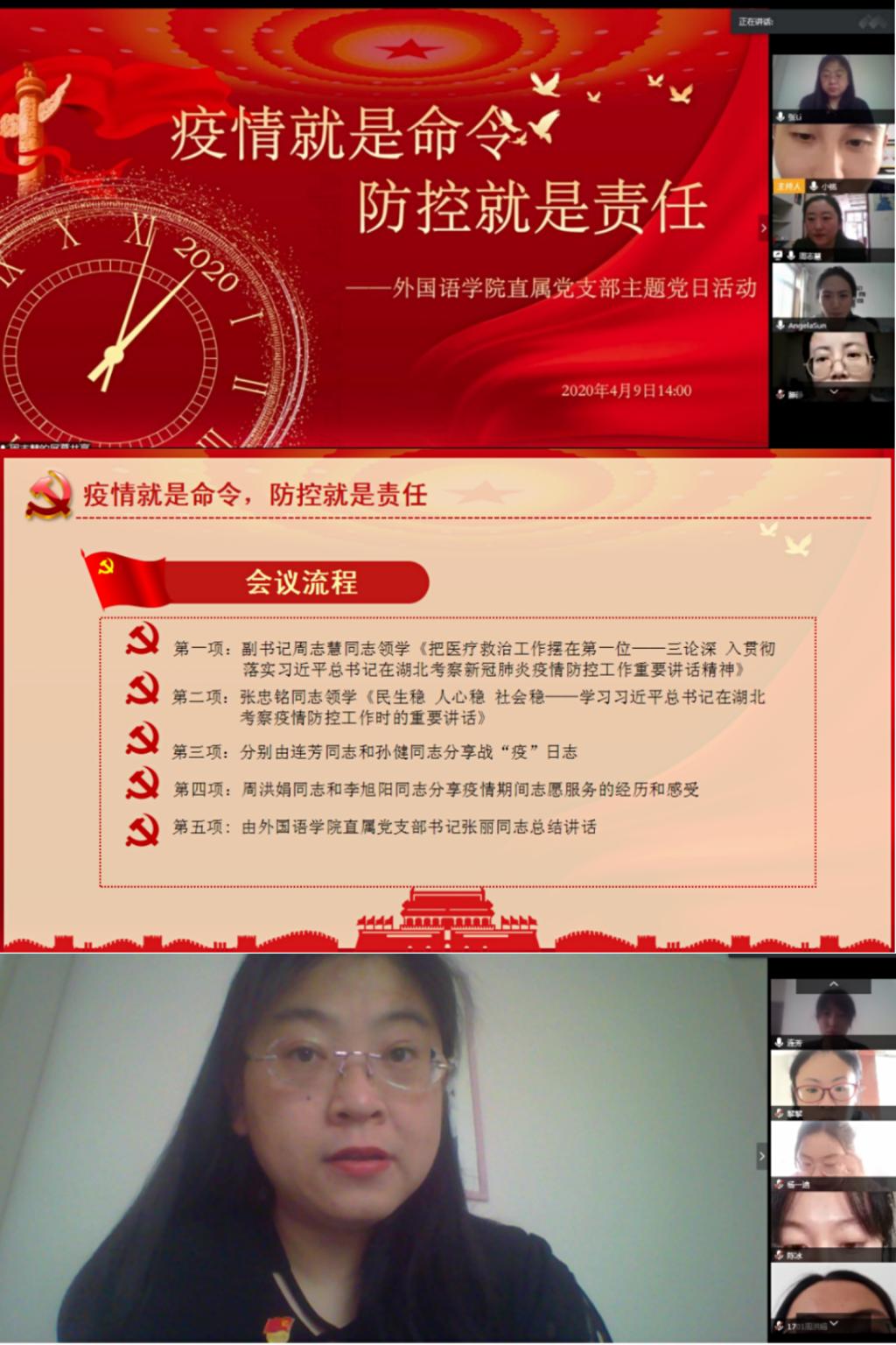 新冠肺炎疫情突发以来,我校各基层党组织积极响应、充分部署,广大师生党员带头参与群防群控行动。我校外国语学院直属党支部坚决贯彻落实中共中央政治局常务委员会会议精神,以视频会议的方式召开“疫情就是命令,防控就是责任”云端主题党日活动,进一步全面落实上级决策部署,围绕学校当前的重点任务和阶段性重点工作,把打赢疫情防控阻击战作为实际行动。外国语学院直属党支部书记张丽、副书记周志慧、纪律委员张军学、组织委员张忠铭、宣传委员连芳以及外国语学院全体师生党员参加了此次党日活动。会议由组织委员张忠铭同志主持。