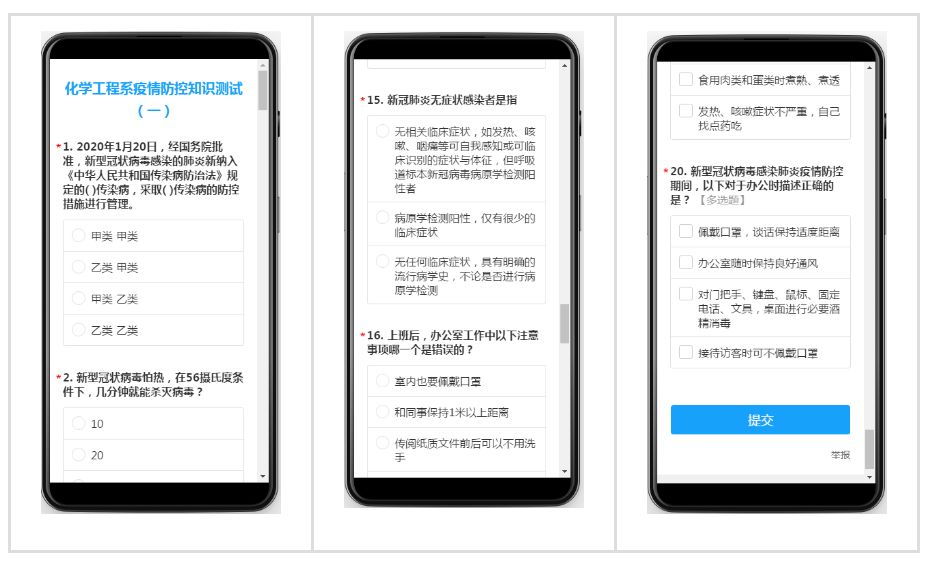 只有了解病毒,才能击败病毒。在这场疫情防控战役中,没有谁是旁观者,每个人都是责任人。化学工程系按照学校新冠肺炎疫情防控工作总体安排,于4月22日组织全系教师进行线上答题活动。每道习题都进行精心挑选,简单实用,测试结束后直接出分,答案解析,方便学习。不仅能使每位教师查漏补缺,也是一次很好的学习机会。通过新冠肺炎知识的学习和测试,化工系教师更充分地掌握了疫情防控知识,增强了对新冠肺炎的防控意识,为顺利返校复学做好了更加充分的准备。