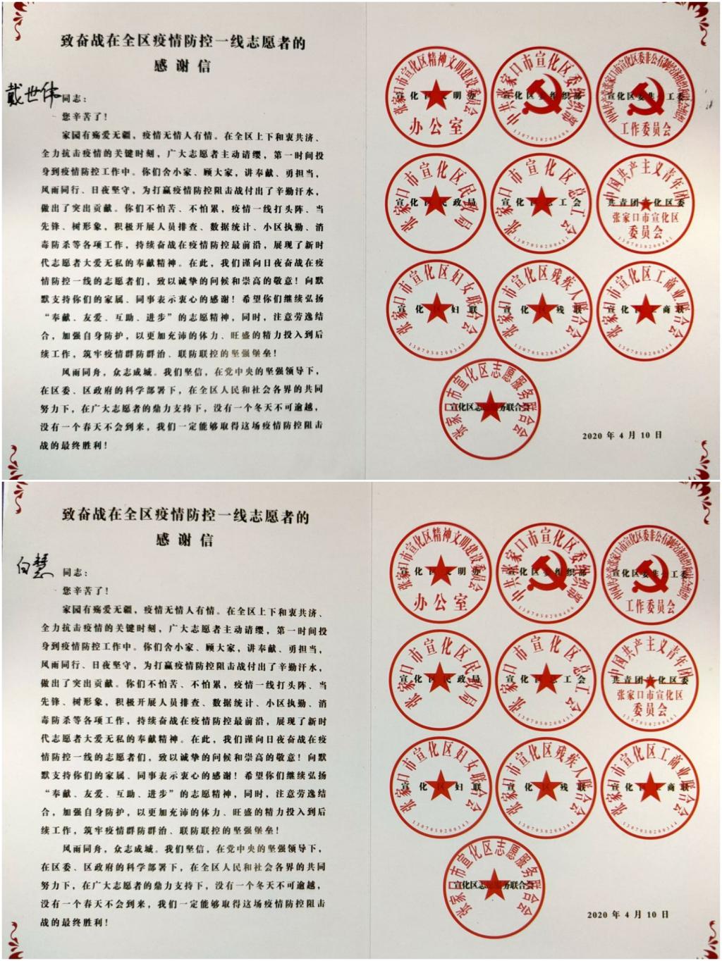 在志愿服务过程中,宣化区委书记张聪对二人及其他优秀志愿者代表进行了亲切问候,赠送一次性口罩、手套等保障物资,并说道:“疫情是无情的,但我们古城宣化人民是有情的。青年就像八九点钟的太阳,永远是那群心中有光、路在脚下的奔跑者,你们的样子就是青年该有的样子。作为代表,要起积极的带头作用,落实好每天的工作,积极完成志愿服务,带领其他志愿者更好更快更高效的完成工作。”