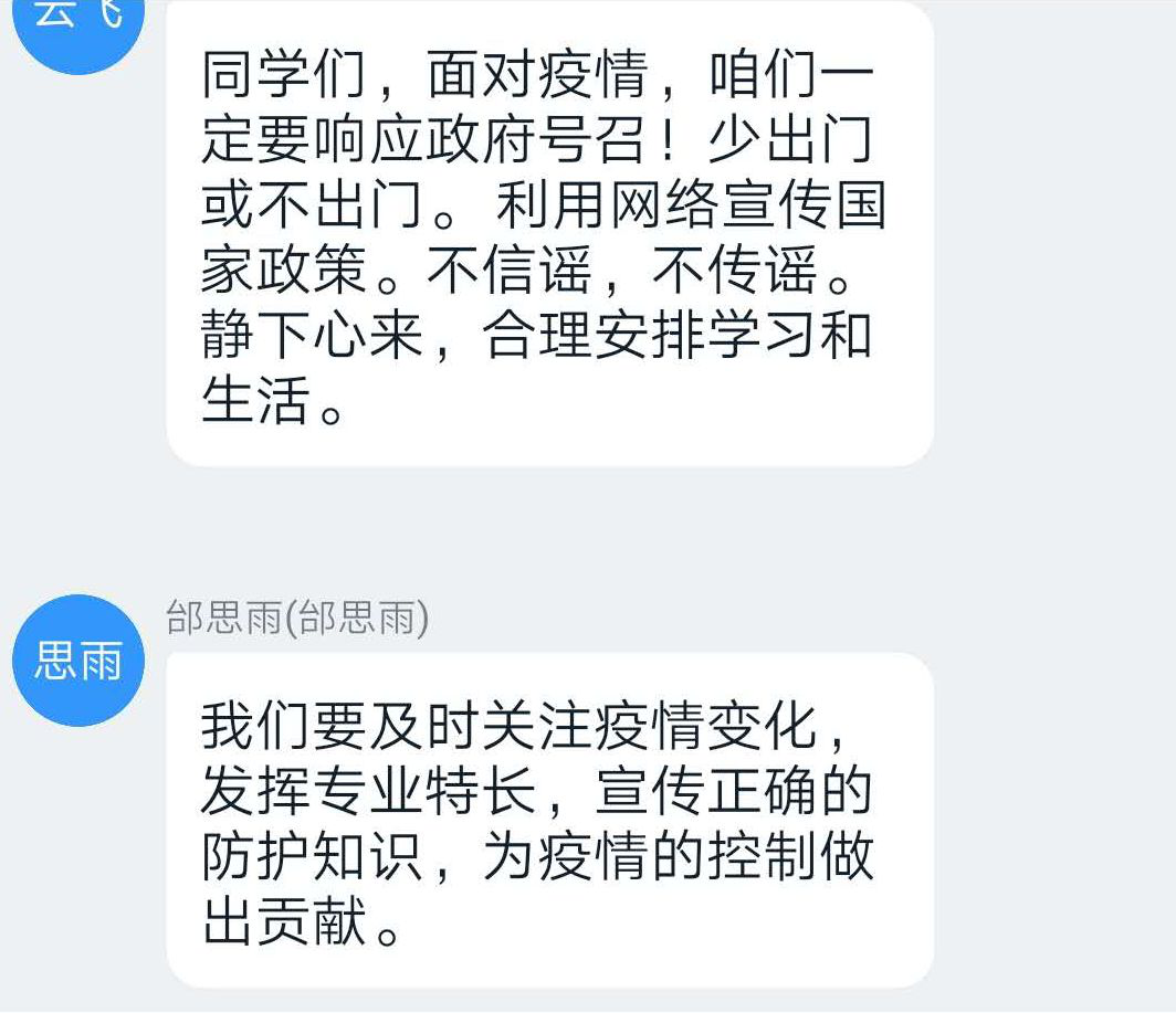 在全国上下一心抗击新冠肺炎疫情的关键时刻,作为新时代大学生,认真落实上级决策部署、全力支持疫情防控工作,是我们义不容辞的责任。我校外国语学院积极响应号召,倡议各班隔空互动,召开以“同心战疫,青年担当”为主题的“云”班会。