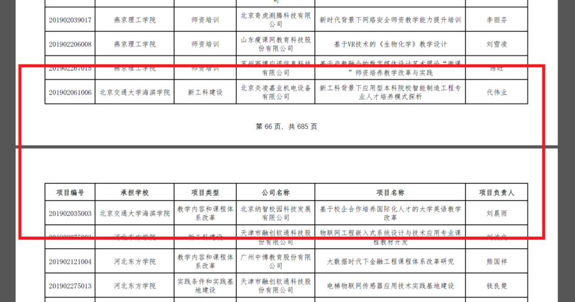 经教育部及合作企业共同评审,我校与北京炎凌嘉业机电设备有限公司合作的《新工科背景下应用型本科院校智能制造工程专业人才培养模式探析》、与北京纳智校园科技发展有限公司合作的《基于校企合作培养国际化人才的大学英语教学改革》2个项目成功获批立项,项目内容涵盖新工科建设、教学内容和课程体系改革两个方面。