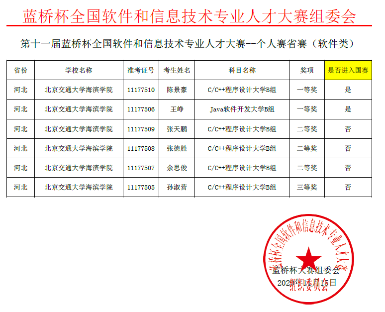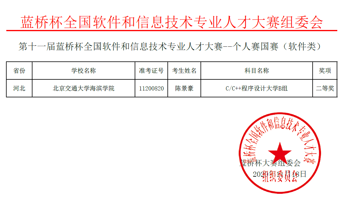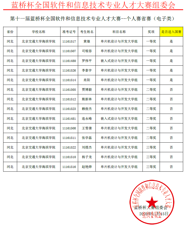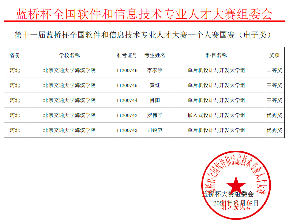 近日,第十一届蓝桥杯全国软件和信息技术专业人才大赛全国总决赛落下帷幕。我校6名同学分别参加软件类和电子类的全国总决赛,通过与北京大学、清华大学等800余所高校的激烈角逐,最终,在单片机设计与开发大学组、C/C++程序设计大学B组、嵌入式设计与开发大学组3个项目中荣获全国二等奖2项、全国三等奖2项、全国优秀奖2项。