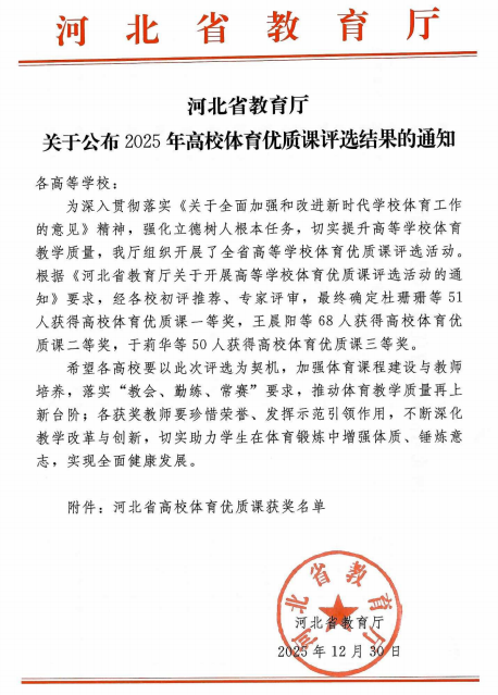 近日,河北省教育厅公布了2025年高校体育优质课评选结果,我校商全乐老师主讲的《大学体育:篮球——掩护挡拆配合》与李涛老师主讲的《大学体育:行进间肩上单手投篮——规则意识与目标导向的教学实践》两门课程,荣获省级优质课三等奖。